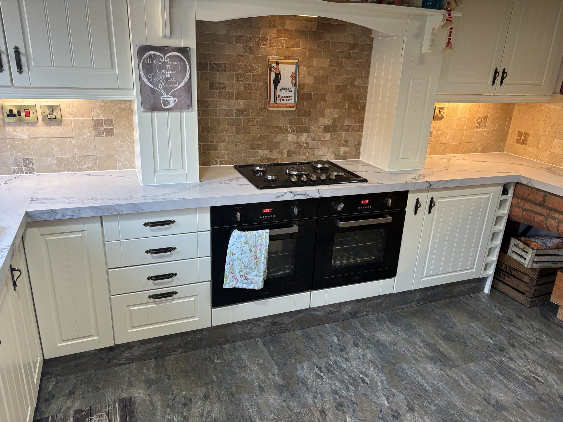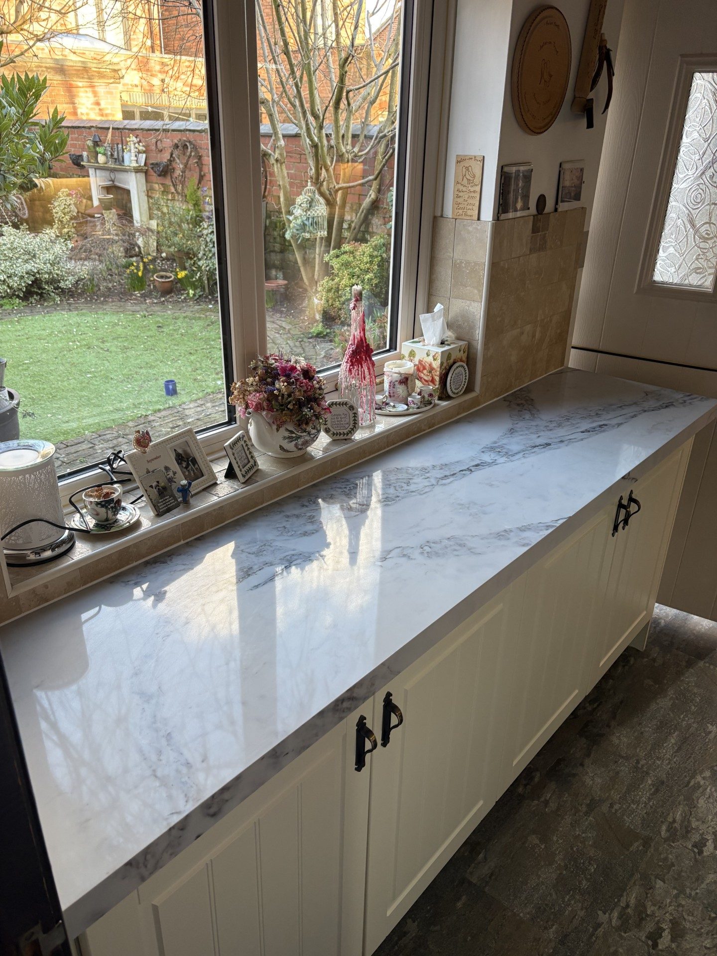 Joe’s Doors removed Helen’s existing wood worktop surfaces and installed Calacatta Retro quartz overlays across the full kitchen run, including around the gas hob, ovens and the brick alcove feature. The pale base colour and soft grey veining help to bounce light around the room, particularly by the window and white sink area, giving a cleaner, fresher look against the cream cabinetry and warm-toned tiles. The overlays were fitted directly over existing worktops — no messy rip‑outs — for less disruption and a quicker install.